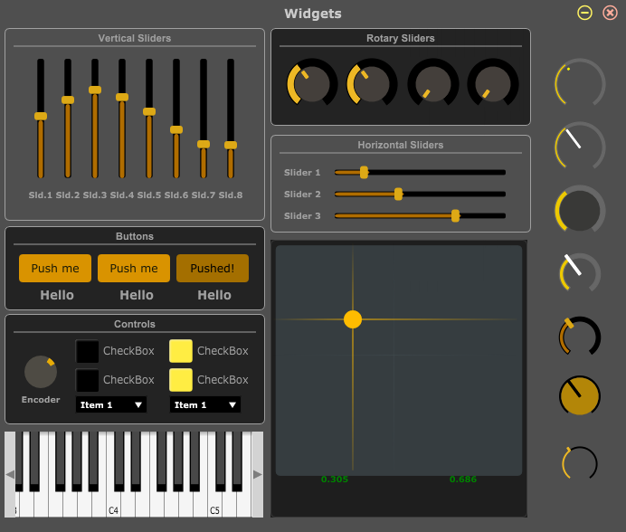 Note the IDE looks a lot better now thanks to Maruo who added custom themes! I should also mention that Csound can be used to control all aspects of any widget on-screen. As it happens, I'm in touch with Bernard off-list about more user-friendly multi-channel configs in Cabbage. We're making progress, but there are still a few issues to iron out. On Fri, 13 Sep 2019 at 09:20, Mauro Giubileo <mgiubileo@computeraltafed.it> wrote: